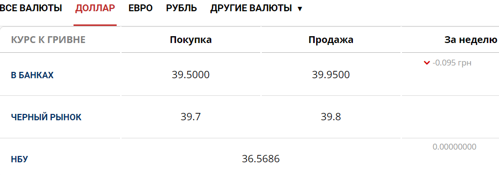 Зараз середній курс долара в українських банках становить 39,50 грн у купівлі та 39,95 — у продажу. На чорному ринку долар купують по 39,70 грн, а продають — по 39,80 грн. Офіційний курс Національного банку України залишається сталим — 36,56.