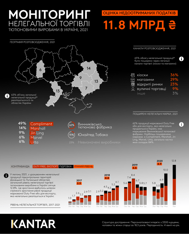 "За результатами дослідження ми бачимо, що рівень нелегальної торгівлі тютюновими виробами в Україні продовжує зростати, і на початку 2021 досяг рекордних значень з початку дослідження у 2011 році", - зазначила аналітик Kantar України Тетяна Свердлик.