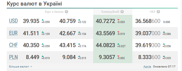 Водночас, в Ощадбанку курс встановлено у купівлі на рівні 40,12 гривні, у продажу — 40,88 гривні. Це на 3 та 2 копійки менше.