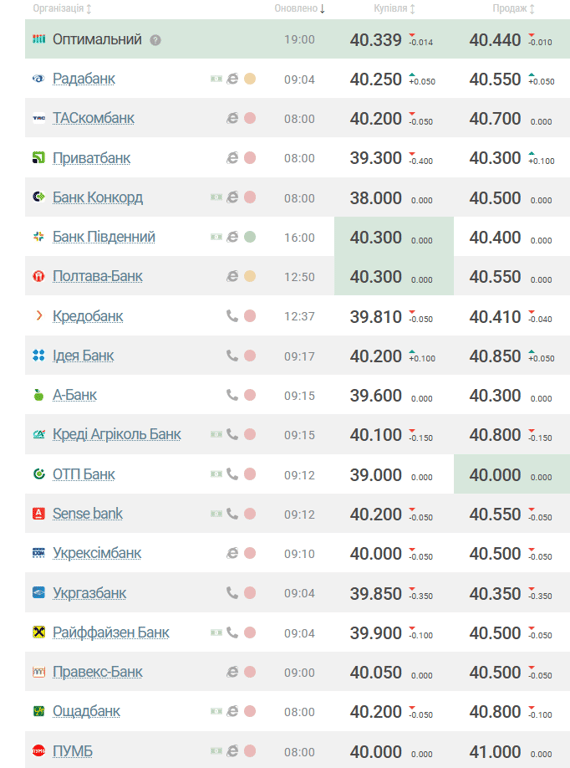ПриватБанк знизив курс долара у купівлі на 40 копійок, до 39,30. У продажу — підвищив на 10 копійок, до 40,30 гривні.