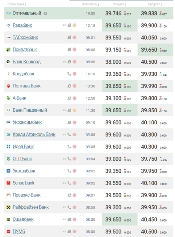 ПриватБанк виставив курс у купівлі на рівні 39,15 грн/дол. (-5 коп.), у продажу — 39,65 грн/дол. (-5 коп.). Ощадбанк купує долар за 39,65, а продає за 40,45 грн/дол.