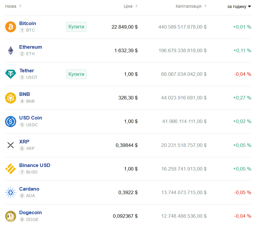 За цими даними, BTC зараз коштує 22,858 тис. доларів. За тиждень ця криптовалюта впала у ціні на 3,95%, а за місяць вдалося підвищитися аж на 34,78%. За рік Bitcoin знецінився на 44,91% щодо долара.