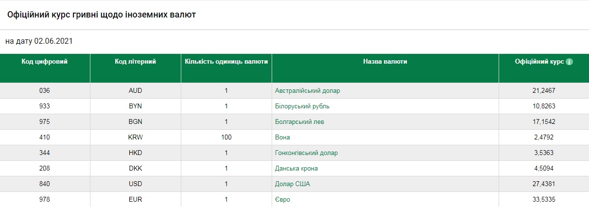 Офіційний курс валют в Україні 2 червня: