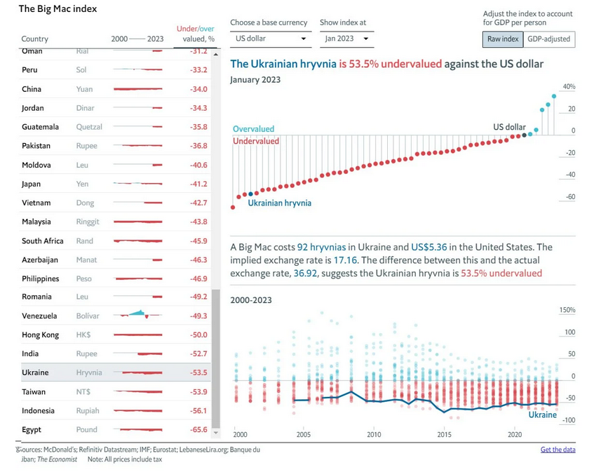 Обмінний курс становить 17,16 гривні за долар, а різниця між цим та фактичним обмінним курсом говорить про те, що гривня недооцінена на 53,5%.