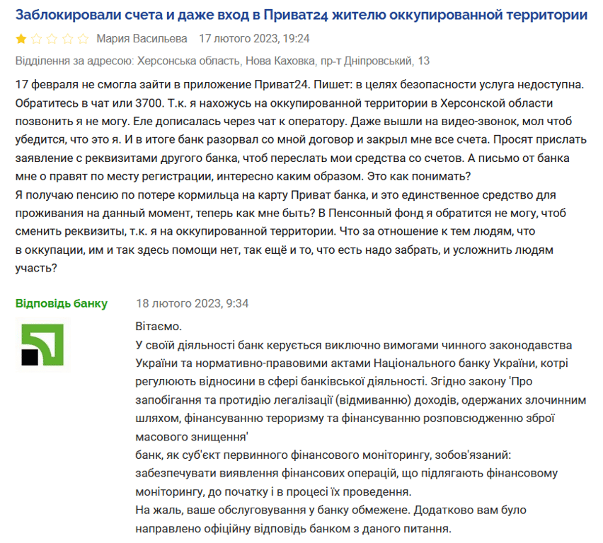 Так, одна з клієнток з-за кордону написала, що ПриватБанк відмовив у продовженні відносин в рамках закону "про протидію фінансуванню тероризму".