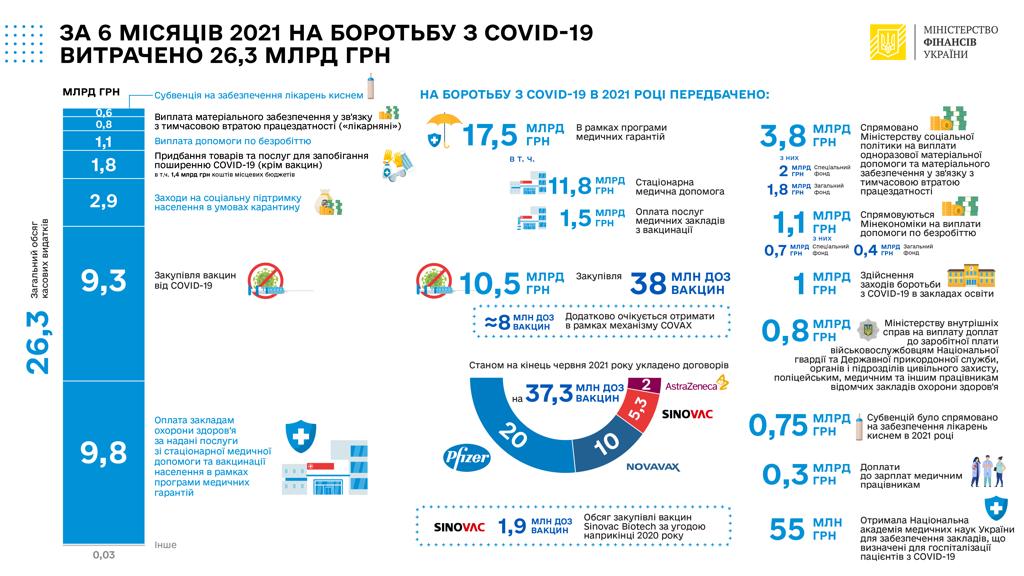 Протягом першого півріччя 2021 року, на боротьбу з коронавірусом було здійснено видатків у розмірі 26,3 млрд гривен.