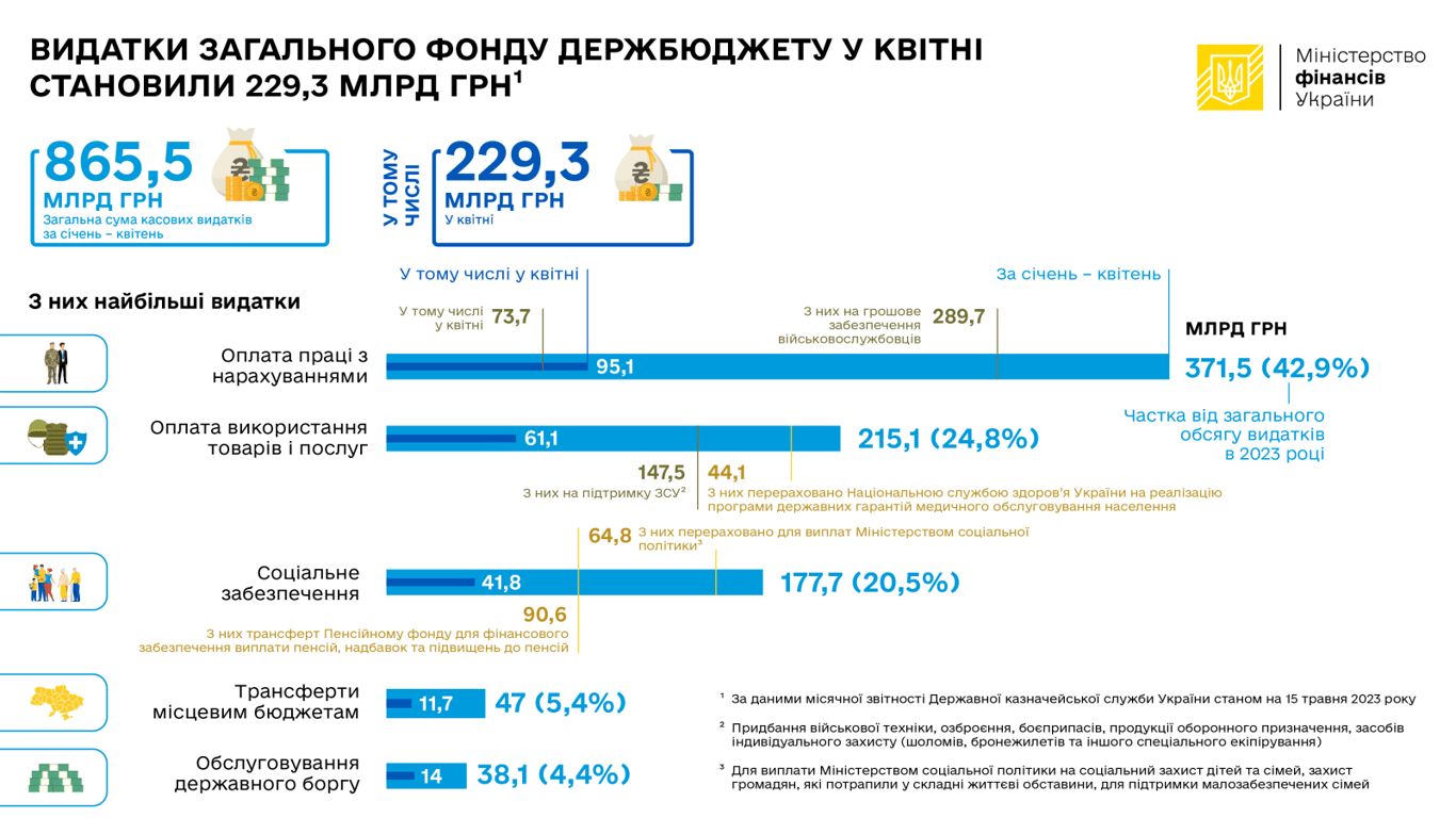 У квітні 24,8% України становили 229,3 млрд грн. Найбільшу частину грошей витратили на оплату праці, в тому числі військовослужбовцям.