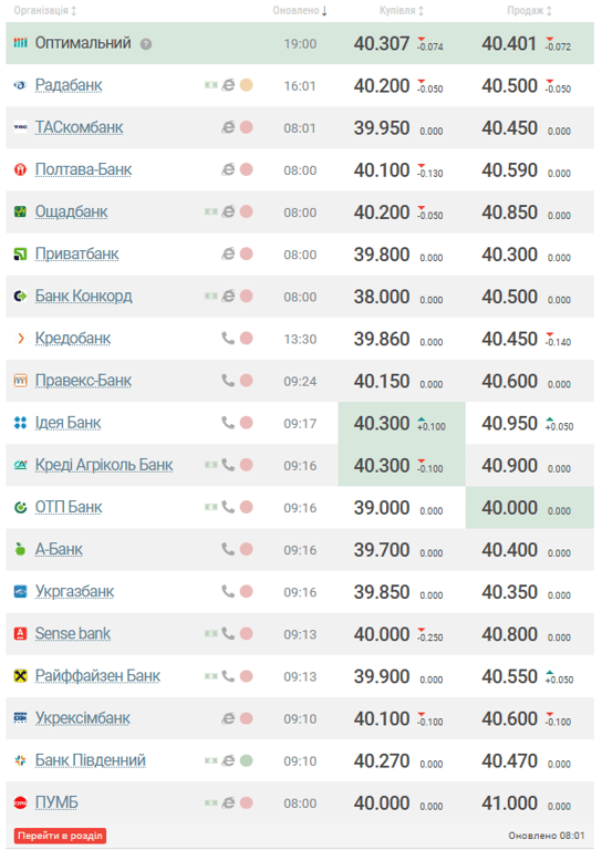 Знизив курс банк "Оптимальний". Наразі валюта торгується в межах 40,30 грн/дол. у покупці, 40,40 — у продажу. Що менше на сім копійок.