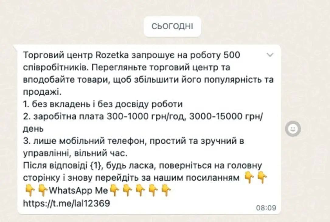 "Це обман, і наприкінці цього листування ви втратите гроші. Відразу чи за тиждень. Вам будуть давати якісь тупі завдання (лайкати застосунки, писати відгуки, коментарі тощо) ви отримаєте трохи грошей (зовсім небагато), щоб ви подумали, що все чесно. Дадуть трохи і наприкінці попросять за свої гроші купити щось дороге та пропадуть", — підкреслив бізнесмен.