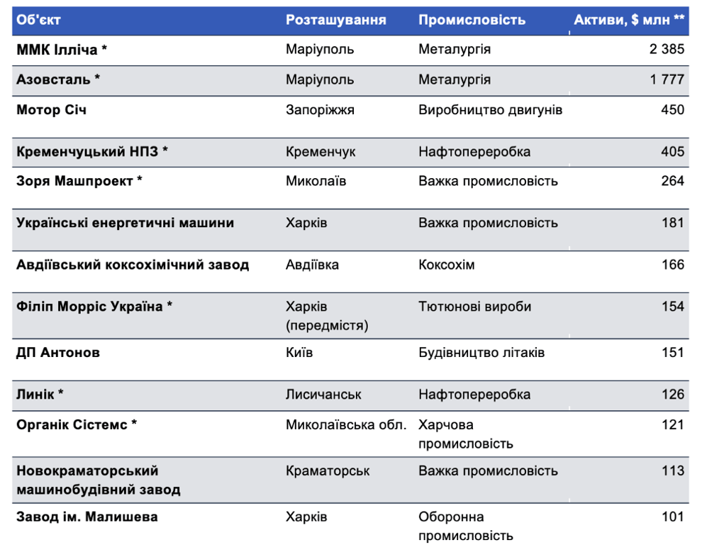 До найбільших підприємств за розмірами активів, що зазнали прямих збитків від збройної агресії росії у 2022 році, увійшли Маріупольський металургійний комбінат імені Ілліча, "Азовсталь", "Нібулон", "Мотор Січ". Згідно з оцінкою експертів проєкту, 19 приватних та державних підприємств (17%) з-поміж великих та середніх зруйновано повністю, ще 90 (83%) пошкоджені частково.