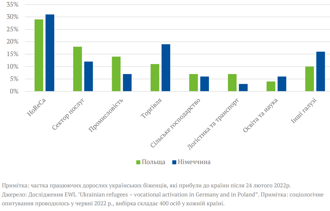 Працевлаштування українських біженців у Польщі та Німеччині за секторами