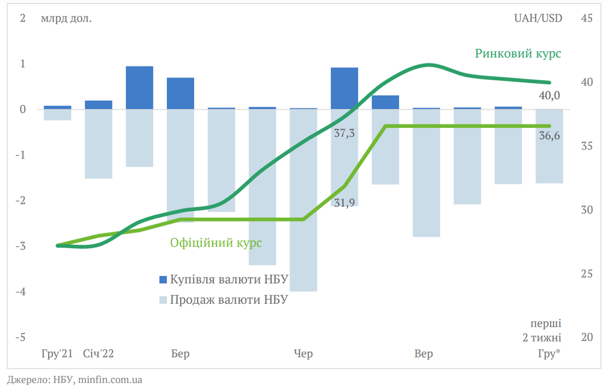 Від початку повномасштабної війни Нацбанк проводить політику фіксованого валютного курсу. Курс зафіксували ще 24 лютого на рівні 29,25 грн/долар. Разом з низкою адміністративних обмежень це рішення дозволило уникнути паніки й обвалу курсу. З часом стала проявлятися розбіжність між офіційним та ринковим курсом валют, і НБУ відкоригував курс, підвищивши його до 36,57 грн/дол.
