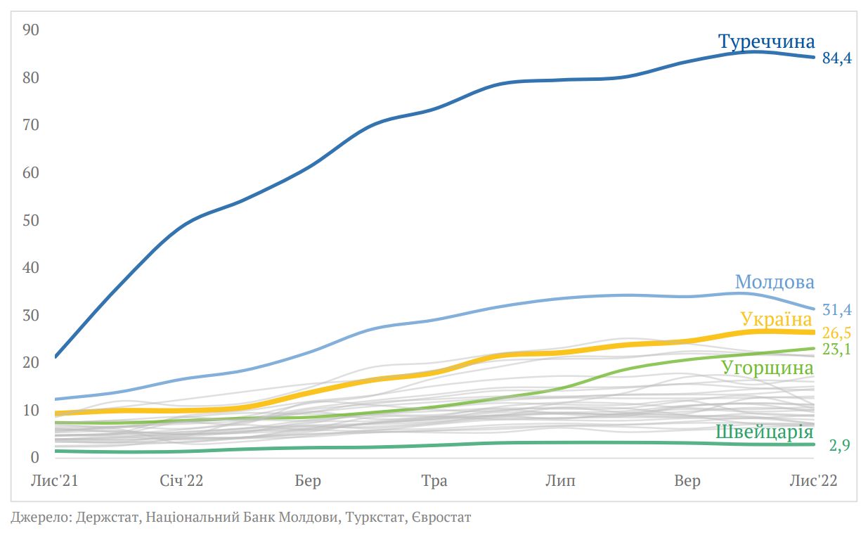 Інфляція у річному вимірі в Україні, країнах ЄС та інших обраних країнах Європи, %