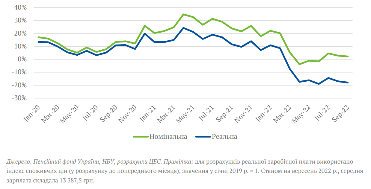 Хоча офіційно публікацію статистики по ринку праці в Україні було припинено, очевидно, що мільйони людей втратили роботу, а реальні доходи значно скоротилися. За оцінками Національного банку України, реальні зарплати за підсумками 2022 року скоротилися на 16%, а в IV кварталі скорочення реальних зарплат сягнуло 23% у річному вимірі.