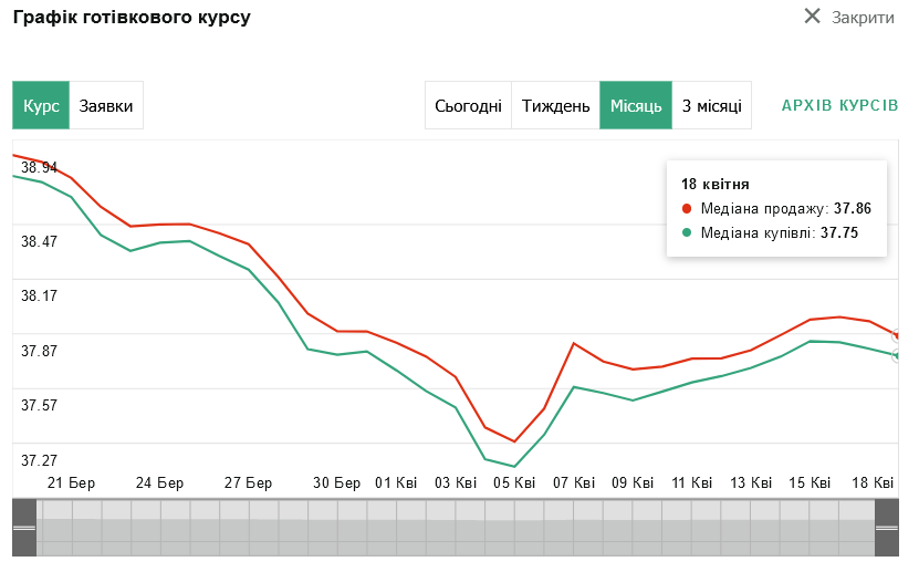 ПриватБанк — 37,30 грн — 37,80 грн;