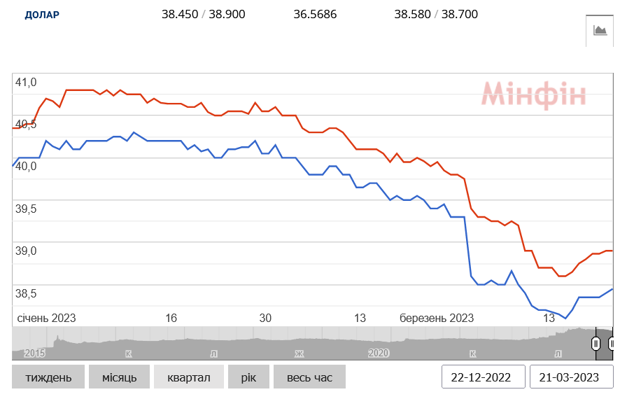 - долар — 38,45–38,9 грн (20 березня — 38,4–38,9 грн);