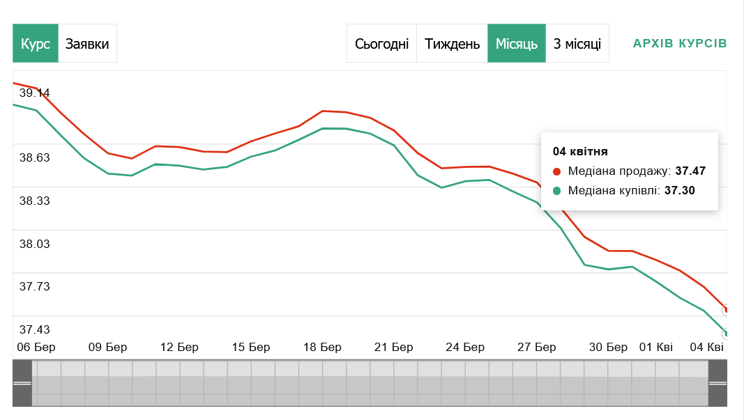 Укрексімбанк — 37,30 грн (-40 коп.) — 37,90 грн (-40 коп.) ;