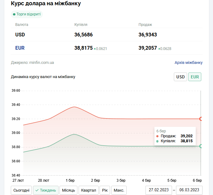 6 березня Національний банк України (НБУ) встановив офіційний курс європейської валюти на рівні 39,20 грн. Показник вищий на шість копійок, ніж було попереднього банківського дня.