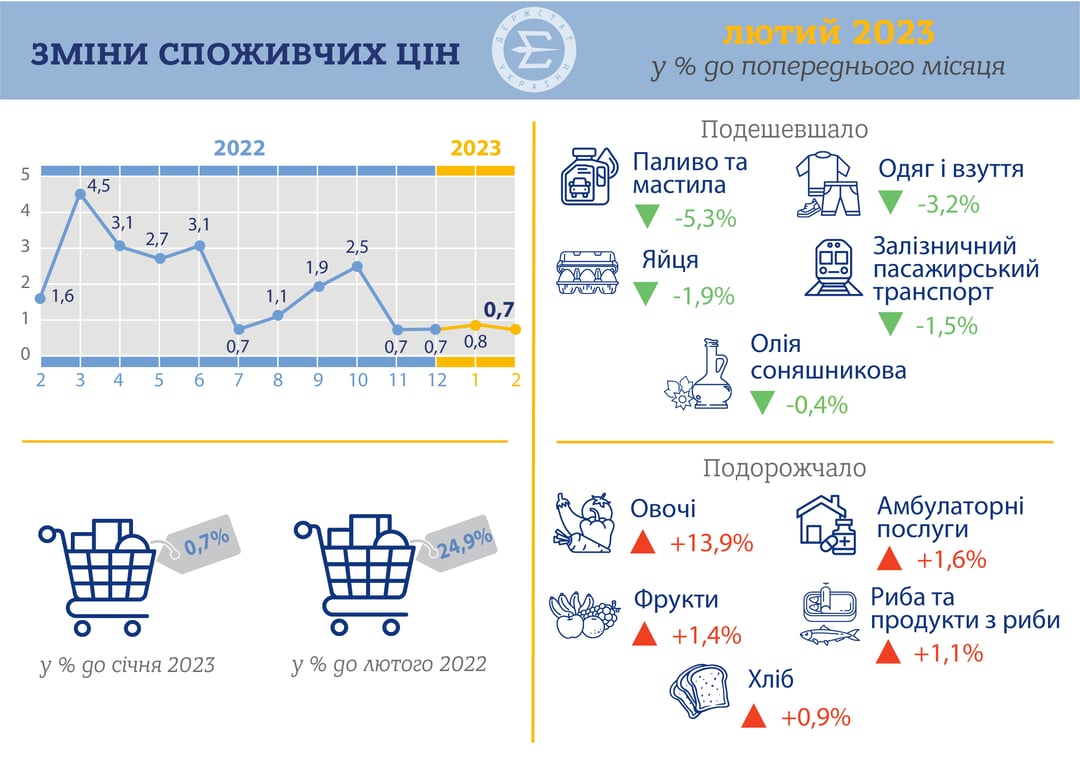 За даними Держстату, середня вартість продуктів у лютому цього року зросла на 31,5% у порівнянні з лютим минулого року. Варто зазначити, що лише за останній місяць зими ціни на продукти та безалкогольні напої підвищились на 1,5%.