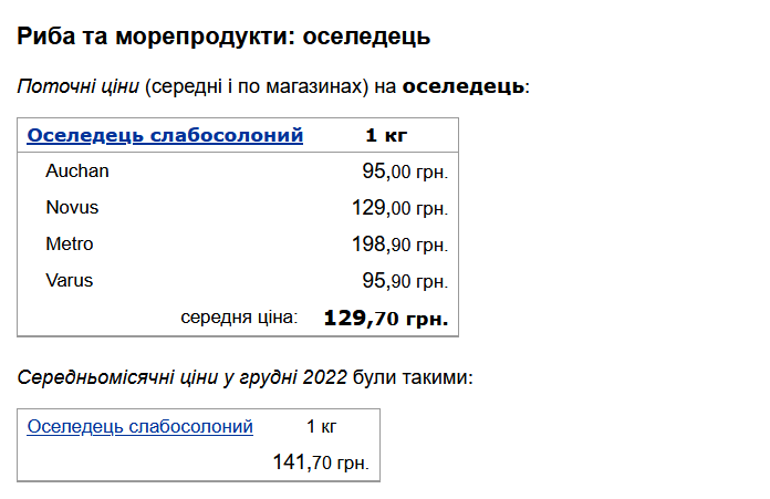 Оселедець слабосолоний пропонують за 129,70 грн/кг., що на 12 гривень дешевше, ніж було у грудні минулого року.