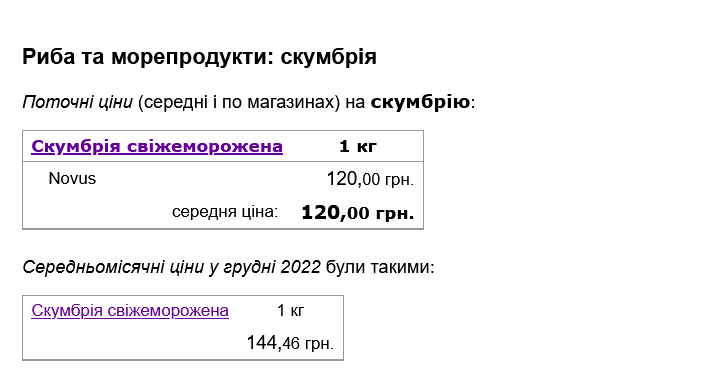 Так, скумбрія свіжоморожена за місяць знизилася в ціні одразу на 24,46 грн/кг. Якщо зараз у магазинах коштує 120 гривень грн/кг, то в грудні кілограм такої риби у середньому коштував 144,46 грн/кг.