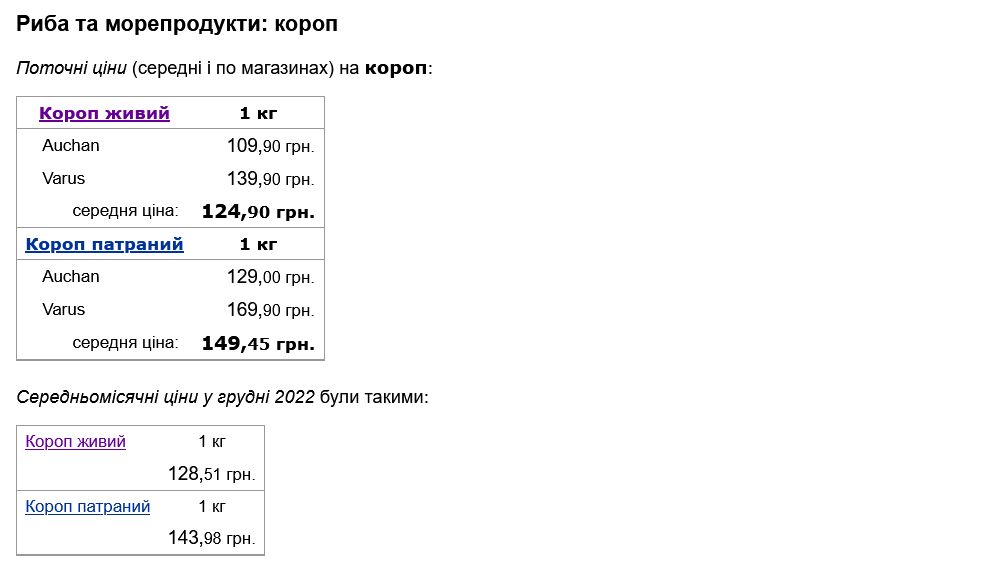 Вартість кілограма коропа живого у супермаркетах зараз у середньому становить 104,90 грн/кг. У грудні коштував 128,51 грн/кг. Короп патраний подешевшав із 143,98 до 126,95 грн/кг.