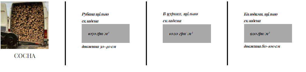 - береза — 1000 грн за 1 м куб. складена колодами, або ж 1200 грн — за рубані дрова