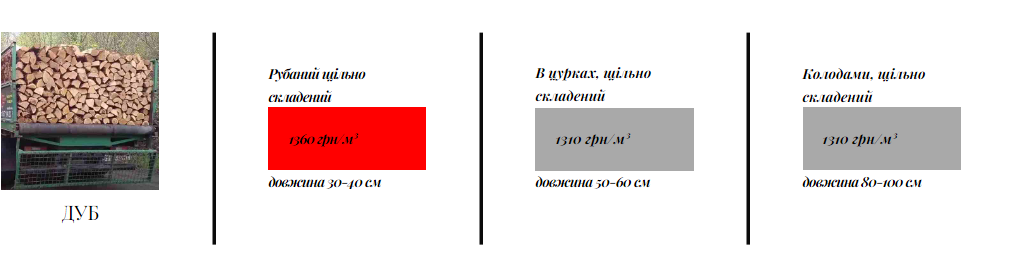 - дуб — 1310 грн за 1 м куб. складений колодами, або ж 1360 грн — за рубані дрова