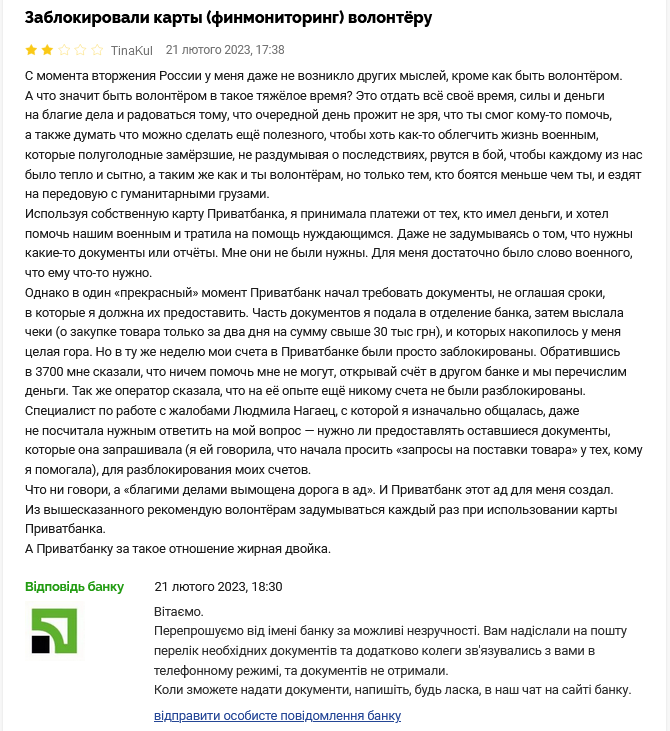 Як повідомила клієнтка банку, вона з початку війни займається волонтерством, допомагаючи українській армії. Вона отримувала перекази на картку, не відкривши рахунок фізособи-підприємця. Згодом її рахунок заблокували через "невідомі джерела надходжень та напрямки витрат". У банку заявили, що потрібні документи для підтвердження законності коштів.