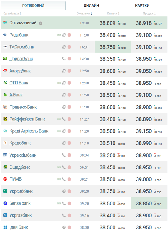 У ПриватБанку долар подорожчав. У купівлі коштує 38,35 грн (+0,10), у продажу — 38,95 грн (+0,10). Райффайзен Банк купує за 38,40 грн (+0,10), продає — за 38,89 грн (+0,06). Ощадбанк долар купує дешевше — за 38,45 грн (-0,20), продає — за 38,95 грн (-0,20).