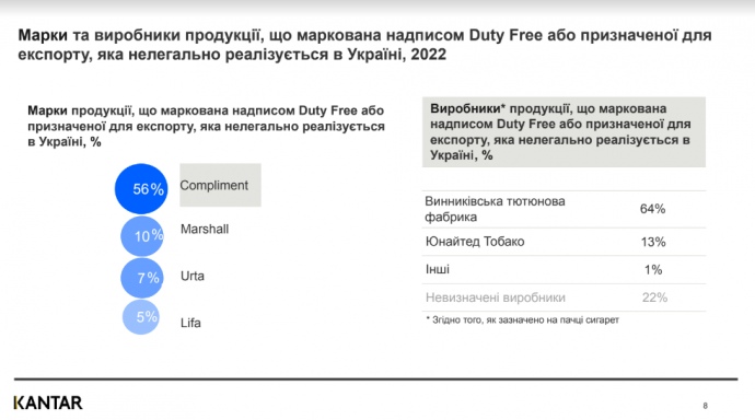 Примечательно, что 64% продукции с маркировкой отметкой Duty Free или предназначенной для экспорта и нелегально продается в Украине, имеет надпись, где указана производителем Винниковская табачная фабрика. Около половины (56%) этой продукции — сигареты Сompliment с обозначением Duty Free.