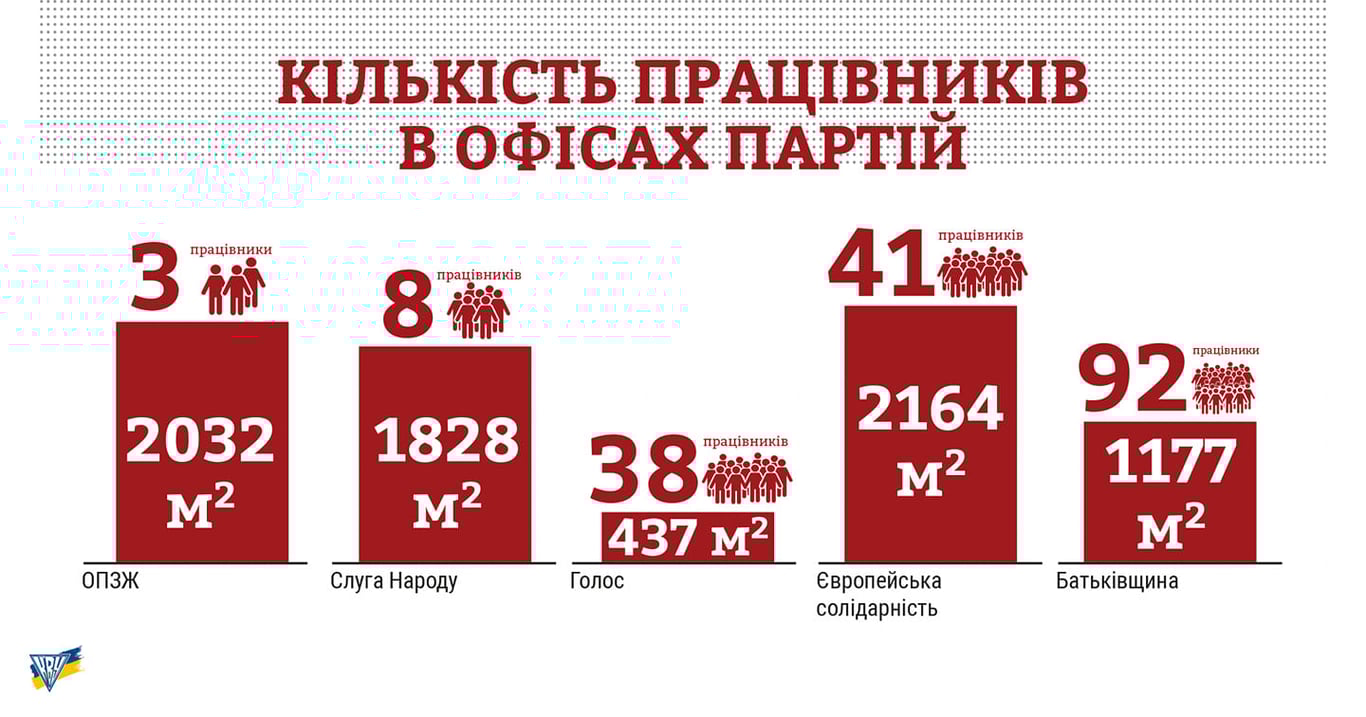 Согласно данным отчета об имуществе, доходах, расходах и обязательствах финансового характера, один работник партии "Слуга народа" в среднем работает на офисной площади размером более 200 кв. м., что является аномально высокой цифрой.