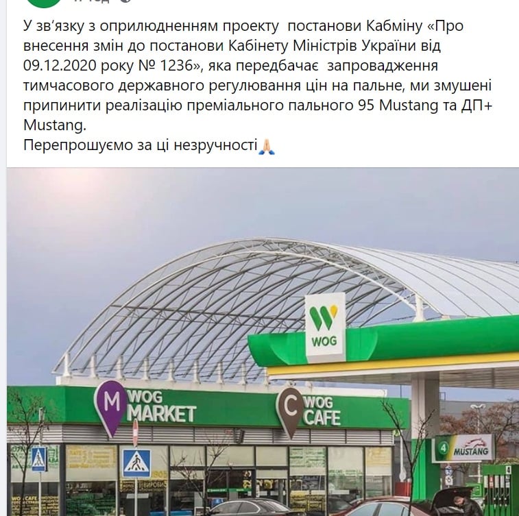 "В связи с обнародованием проекта постановления Кабмина "О внесении изменений в постановление Кабинета Министров Украины от 09.12.2020 года № 1236", которое предусматривает введение временного государственного регулирования цен на топливо, мы вынуждены прекратить реализацию премиального топлива 95 Mustang и ГП+ Mustang.