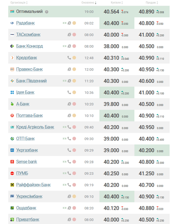 В то же время в Ощадбанке курс установлен в покупке на уровне 40,12 гривны, в продаже — 40,88 гривны. Это на 3 и 2 копейки меньше.