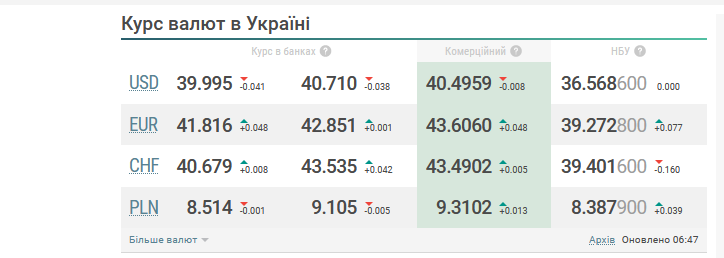 В среднем доллар в покупке стоит 39,99 гривны, в продаже — 40,71, что соответственно на 4 и 3 копейки дешевле по сравнению с предыдущим банковским днем.