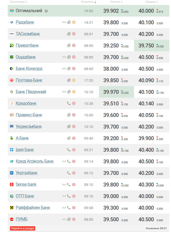 В Райффайзен Банк курс не изменился, в покупке стоит 39,30 грн/долл., а в продаже — 40,00 грн/долл.