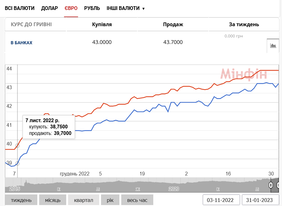 Динамика курса евро на наличном рынке по данным портала Мinfin: