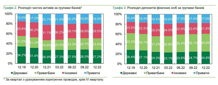 "Из-за значительных поступлений средств клиентов, в частности благодаря государственным выплатам, продолжается рост доли государственных банков (включая ПриватБанк) по депозитам физических лиц — на 0,8 п. п. до 60,6%", — констатируют в НБУ.