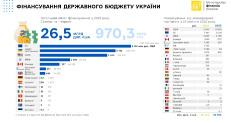 В частности, по данным Министерства финансов Украины на 24 мая 2023 года для финансирования государственного бюджета было привлечено $32,1 млрд в 2022 году и $18,5 млрд в 2023 году от международных партнеров в виде кредитов и грантов.