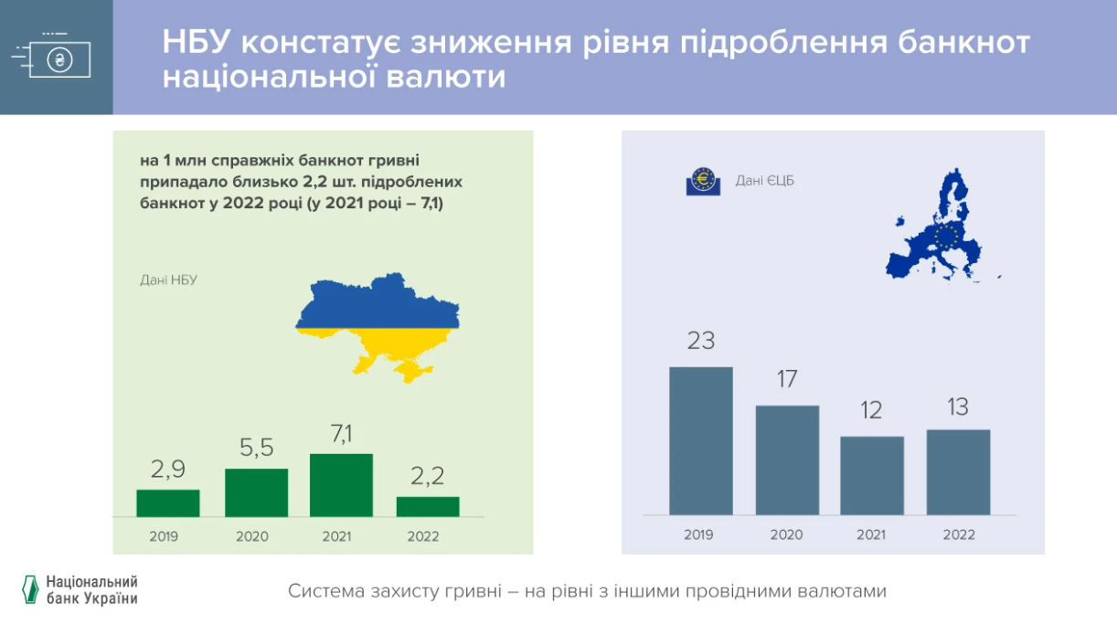По данным пресс-службы, по итогам прошлого года на 1 млн шт. настоящих банкнот гривне приходилось около 2,2 поддельных банкнот (по итогам 2021 года — около 7,1 банкноты).