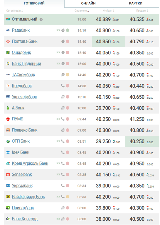 В частности, доллар в ПриватБанке стоит 39,80 (покупка)/40.30 (продажа) гривны. До этого почти каждый день дорожал, а сейчас снизился на 10 копеек.