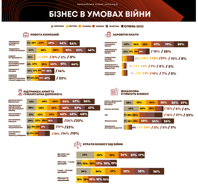 Военный год существенно отразился, в частности, на финансовых результатах предприятий. По оценкам Европейской Бизнес Ассоциации, объединяющей более 900 компаний, по итогам года большинство предприятий зафиксировали падение доходов в долларах США: у 29% компаний произошло падение доходов до 20%, у 54% — падение на 21% и больше. Только 6% компаний сообщили об отсутствии изменений, и еще 11% могут похвастаться ростом доходов в столь сложный год.