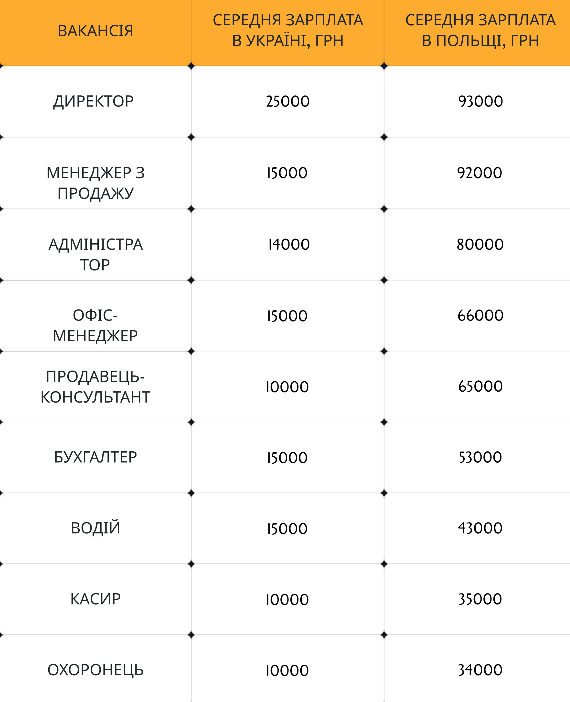 Примечательно, что показатель оказался в несколько раз выше. В частности, зарплата директора в Украине — 25 тыс. грн, а в Польше — 93 тыс. грн. Зарплата менеджера по продажам в Украине — 15 тыс. грн против 92 тыс. грн — в Польше. Меньше всего платят в этой стране кассирам и охранникам — 35 тыс. грн, в Украине — 10 тыс. грн.