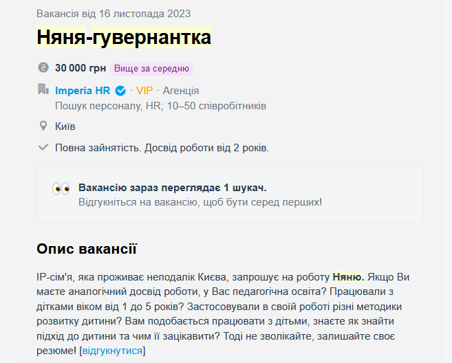 Также можно устроиться на работу гувернантки в VIP-семью. В частности, в одной из вакансий приглашают на работу женщин в семью, проживающую возле Киева.