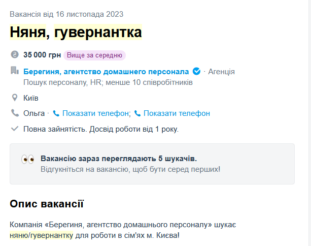 Отмечается, что вакансию разместило одно из агентств домашнего персонала. На работу в семьях Киева ищут женщин, желательно, с педагогическим или медицинским образованием. Также можно без опыта, но с предварительным обучением.