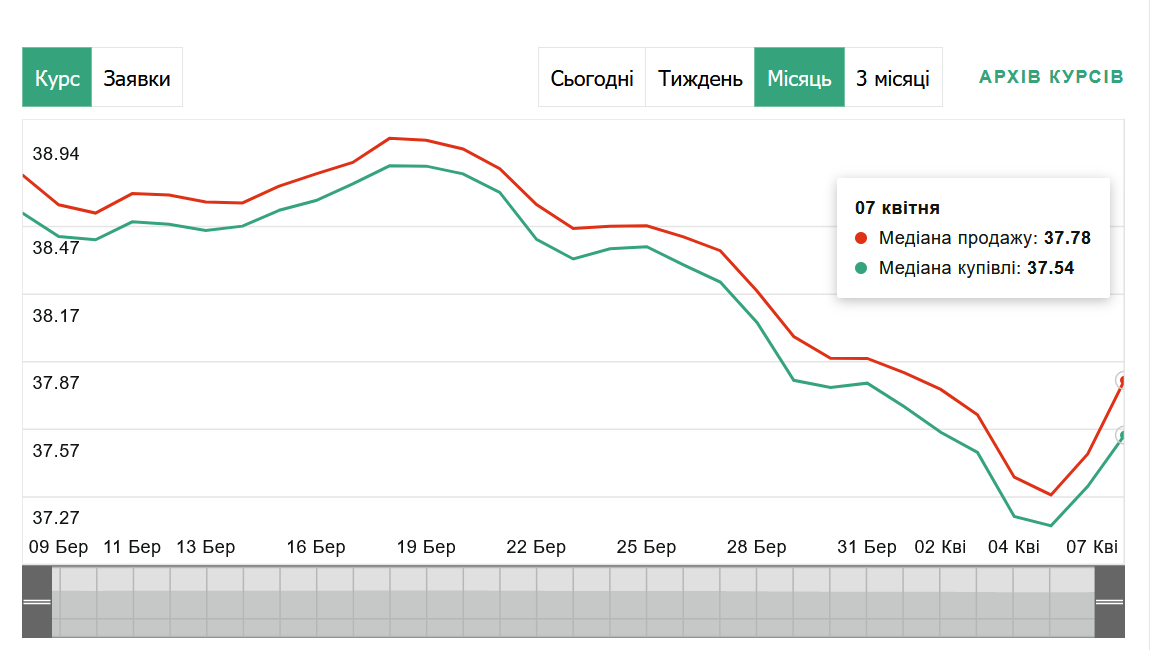 ПриватБанк — 37,05 грн — 37,55 грн;
