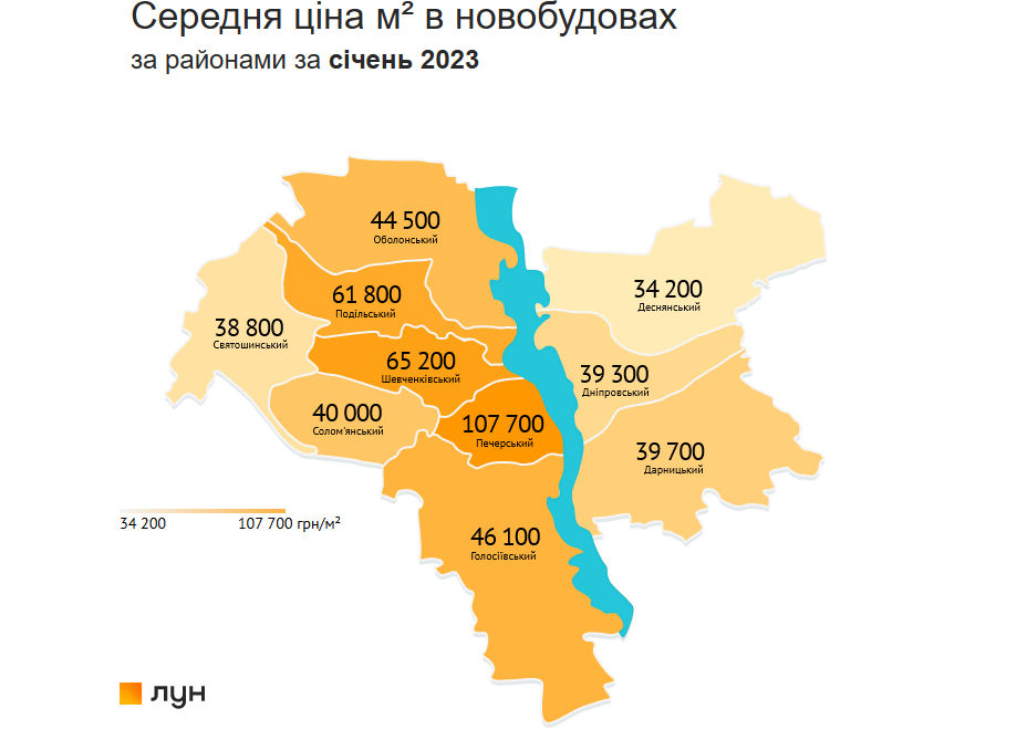 В частности, в Киеве сейчас средние цены на жилье в новостройках по данным портала ЛУН колеблются от 34,2 тыс. грн за 1 кв. м до 107,7 тыс. грн.