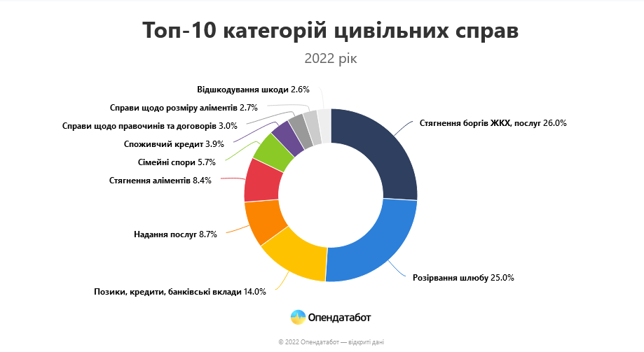 "Из-за полномасштабного вторжения и оккупации части страны рф к украинских судов возросла нагрузка и это сказалось на сроках судебного разбирательства. Мы проанализировали данные ГСА и нашли типы дел, блокирующих юридическую систему", — говорится в сообщении.