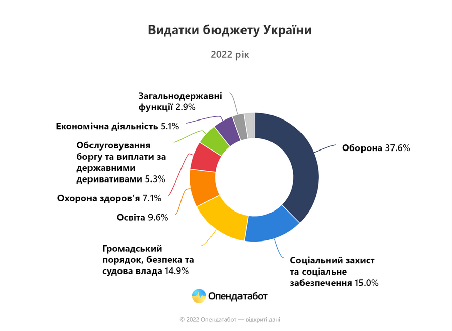 Из-за развязанной россией войны в 2022 году Украина была вынуждена усилить финансовые расходы на оборону в девять раз. Доля в государственном бюджете составляла 38% или 1142,9 млрд гривен.