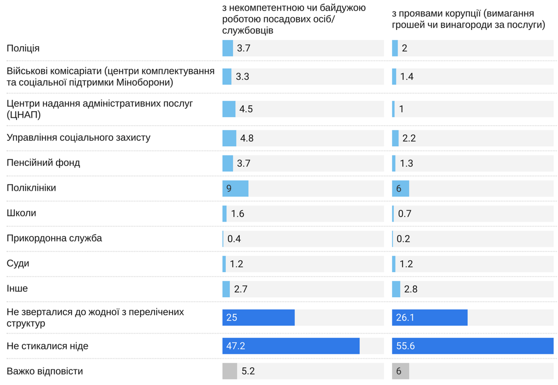 Украинцы рассказали об уровне коррупции и компетентности тех или иных государственных органов. Большинство (55%) заявило, что в течение 2022 года не приходилось сталкиваться со взяточниками.